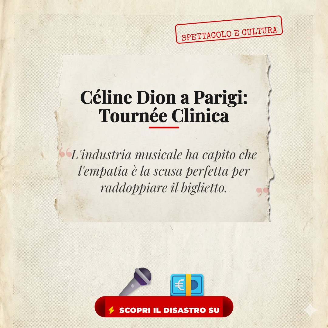 IL TEATRO DELL’ASSURDO: La maestosa industria dell’intrattenimento globale certifica il miracoloso ritorno sulle scene di Céline Dion, pianificando dieci date monumentali nella capitale francese. La sofferenza clinica viene così spettacolarizzata e monetizzata con la precisione chirurgica di un tour mondiale da tutto esaurito.