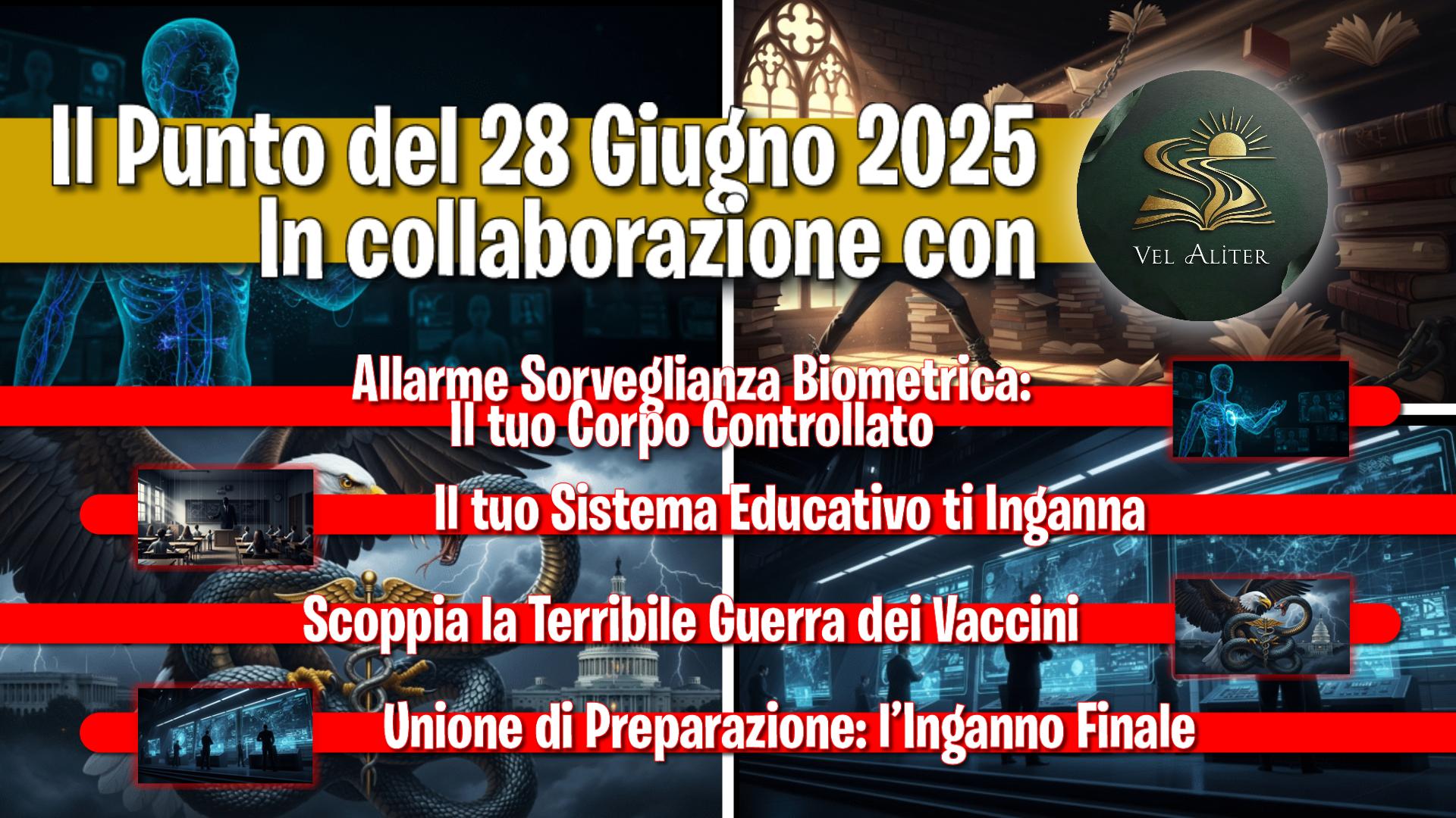 Miniatura del podcast "Il Punto" del 28 giugno 2025 in collaborazione con VElAliter. L'immagine elenca i temi della puntata: sorveglianza biometrica, sistema educativo, guerra dei vaccini e Unione di Preparazione.