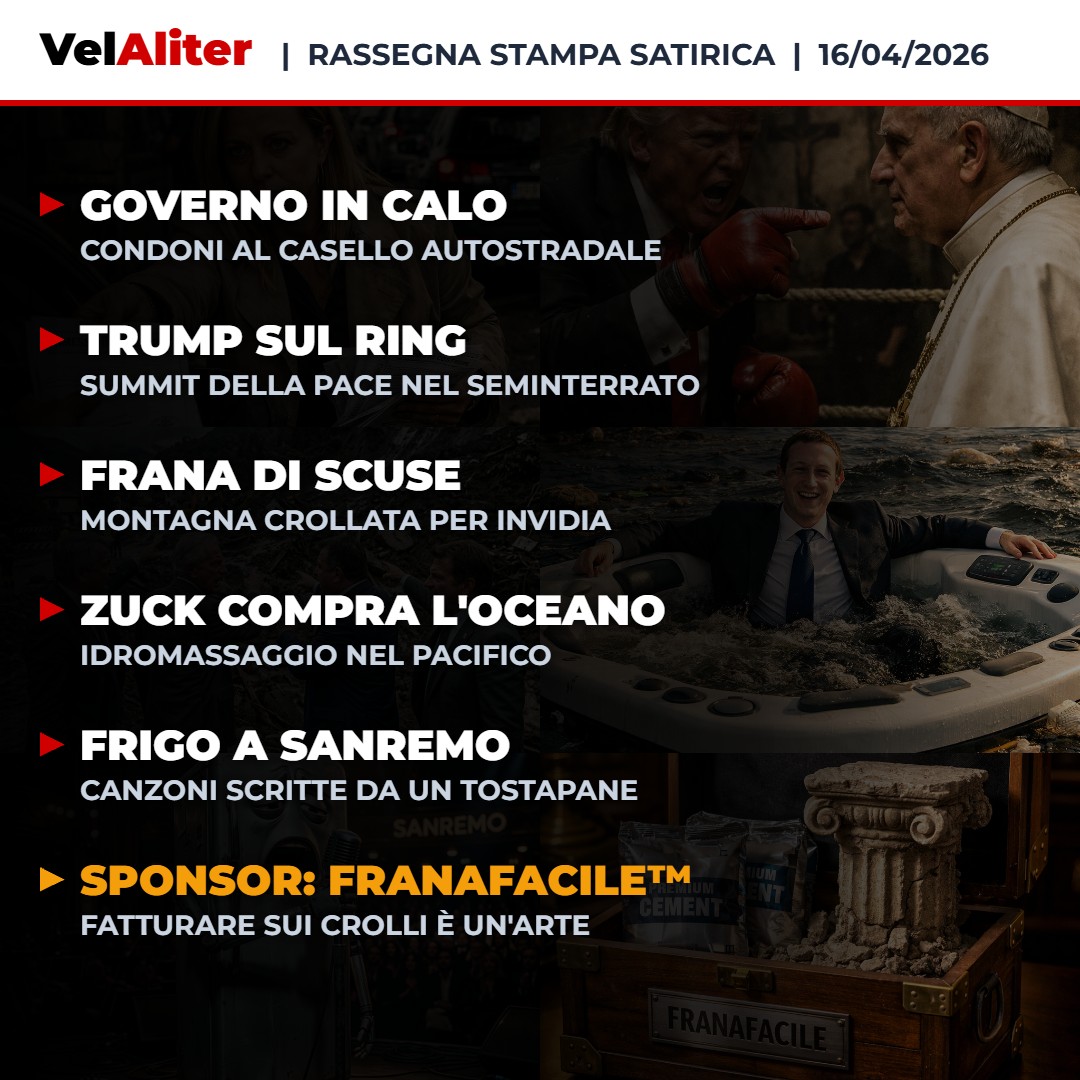 Questa rassegna stampa satirica è l’unico argine logico in un martedì che puzza di crollo strutturale. Tra i ministri del Governo pronti a barattare condoni edilizi pur di raccattare due punti percentuali e Trump che decide di trasformare la diplomazia vaticana in un match di wrestling, c’è da chiedersi se l’apocalisse non sia già passata senza avvisarci. Nel frattempo, in Sicilia, quattro ex presidenti spiegano ai giudici che la frana è crollata per pura invidia del loro talento amministrativo. E se pensate di salvarvi ascoltando musica, sappiate che a Sanremo il prossimo vincitore sarà un algoritmo con l’anima di silicio e il carisma di un tostapane.