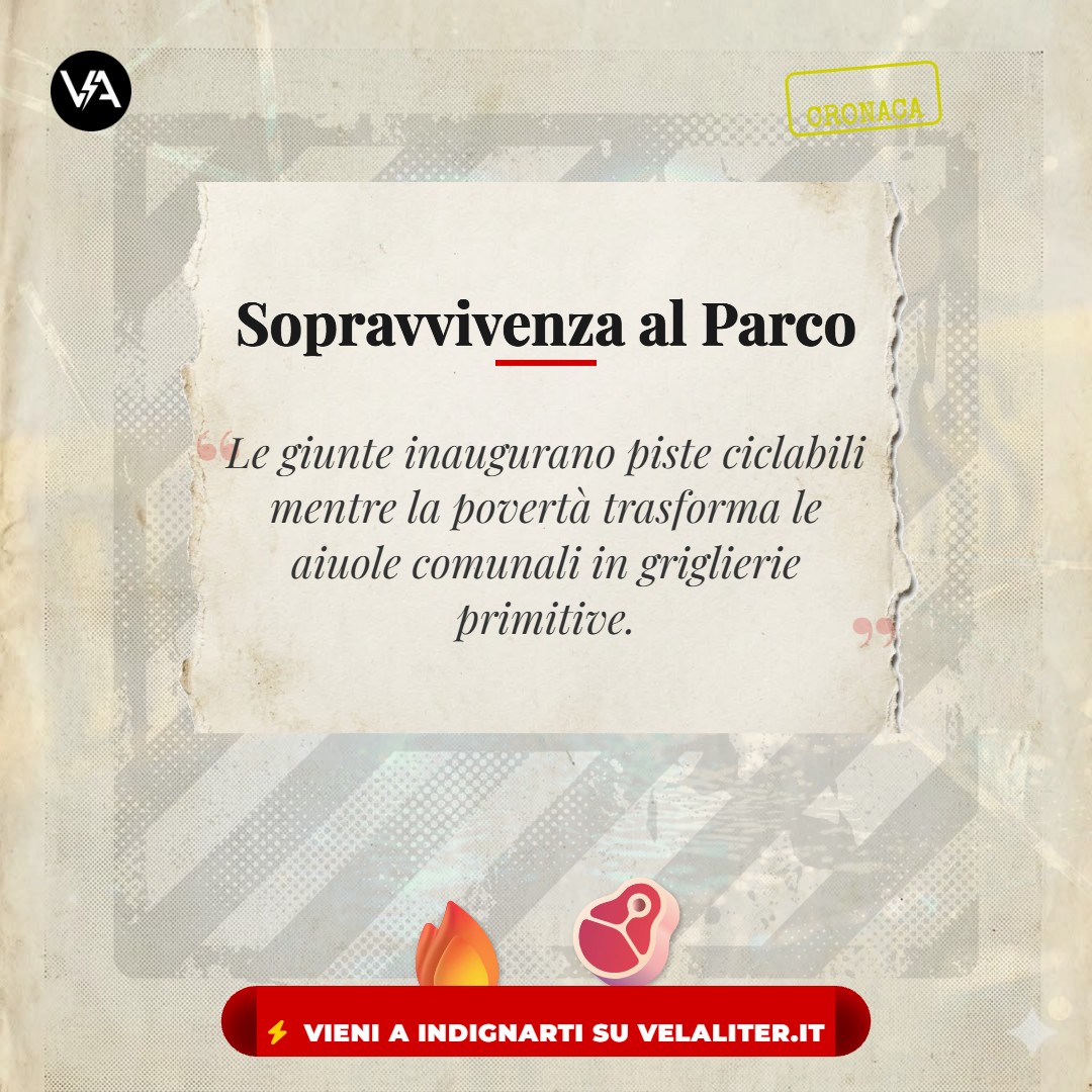 IL CONTO DA PAGARE: Le geniali commissioni locali proporranno sicuramente l’installazione di eleganti cartelli con il divieto assoluto di barbecue abusivi, convinti che un pezzo di latta imbullonato possa miracolosamente curare l’abisso sociale. Finiranno per tassare i resti dei fuochi da campo per fare cassa, promuovendola come nuova esperienza di street food estremo.