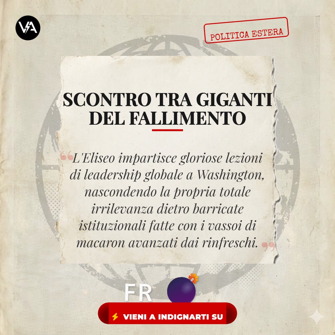 IL TEATRO DELL’ASSURDO: Emmanuel Macron, con il suo paese regolarmente a ferro e fuoco, trova il coraggio istituzionale di impartire dure lezioni di leadership a Donald Trump. La smisurata superbia di un presidente che ha perso le chiavi di casa propria ma pretende di arredare l’intero continente americano.