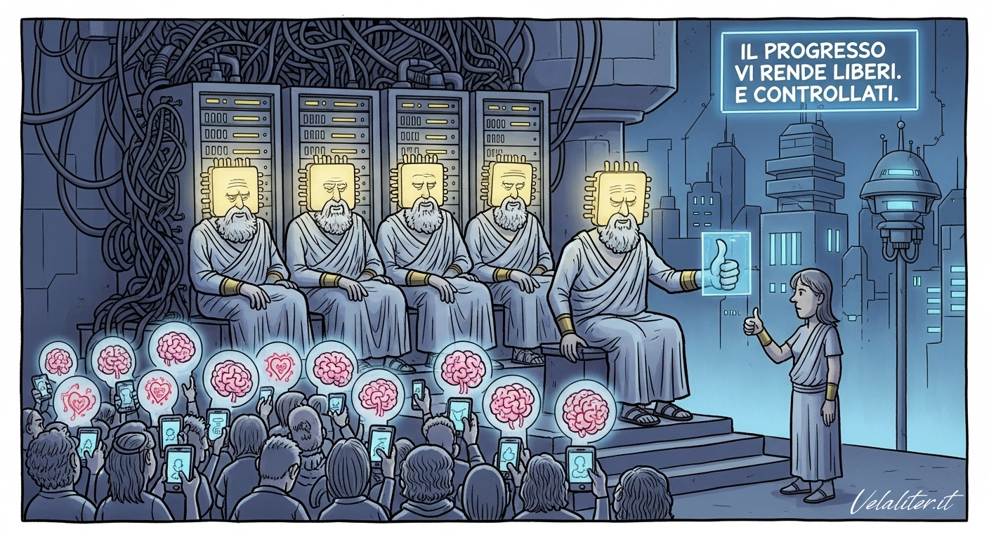 Mentre i nuovi profeti della Silicon Valley promettono un paradiso di efficienza e connessione, la tecnocrazia tesse la sua tela. Un'analisi impietosa di come l'innovazione, presentata come soluzione a ogni male, diventi il più subdolo strumento di controllo. Preparati a scoprire il prezzo reale del "progresso": la tua volontà, barattata per un like e un'app che ti dice quando respirare.