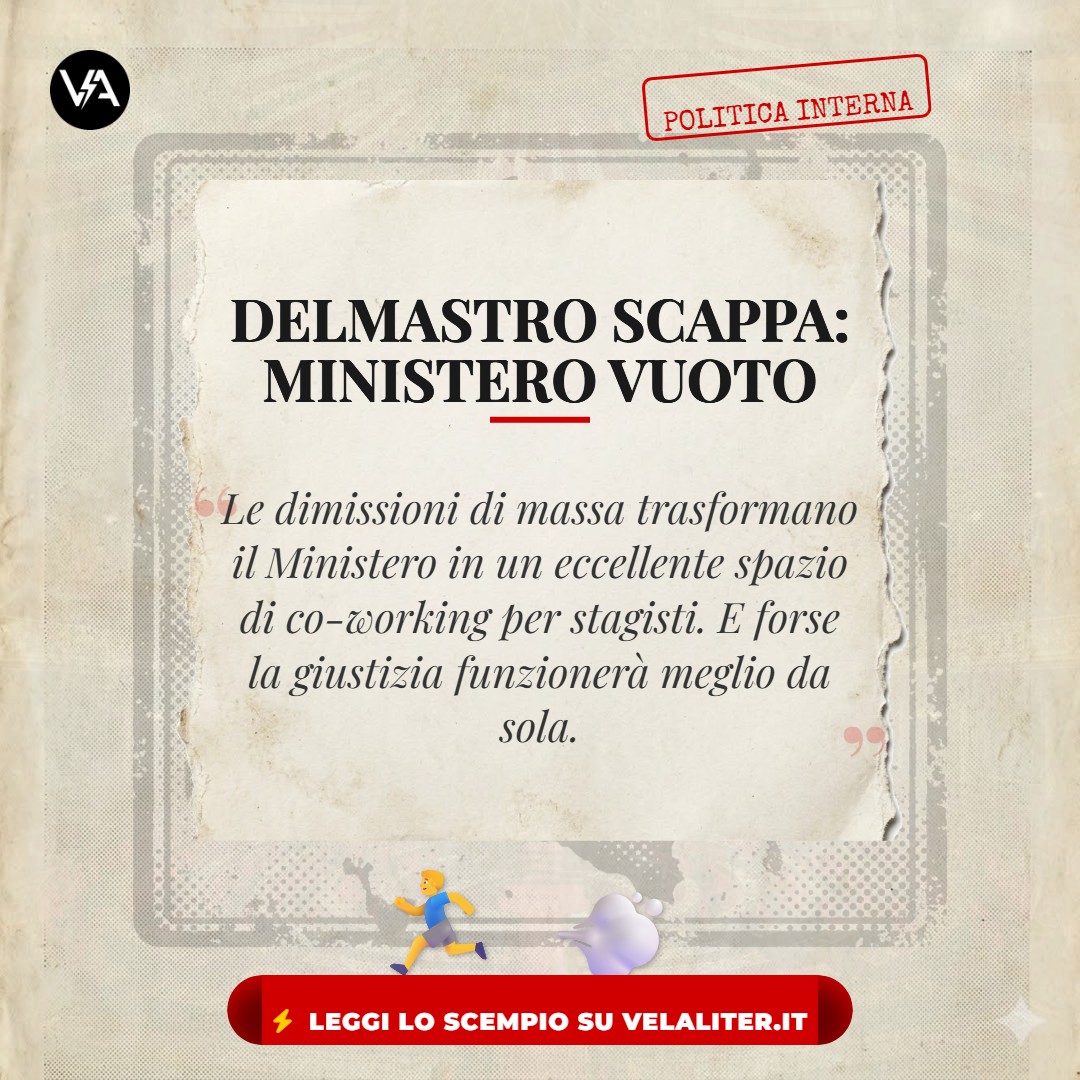 IL TEATRO DELL’ASSURDO: Il Ministero della Giustizia perde pezzi a una velocità imbarazzante. Andrea Delmastro e Giusi Bartolozzi hanno rassegnato le dimissioni, svuotando i corridoi di via Arenula in un fuggi fuggi generale che ha trasformato il dicastero in un eccellente spazio di co-working per stagisti.