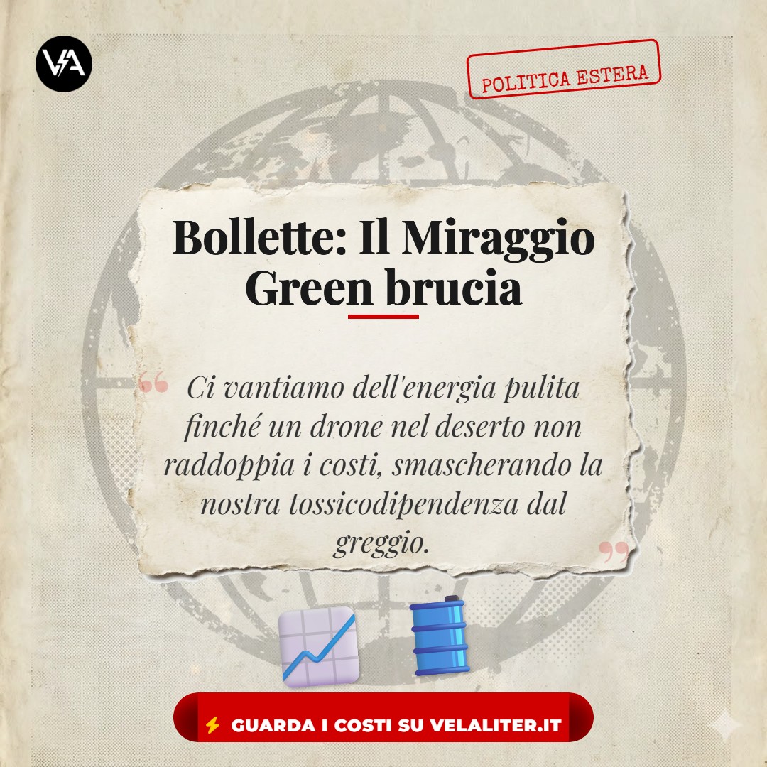 “Ci vantiamo dell’energia pulita finché un drone nel deserto non raddoppia i costi, smascherando la nostra tossicodipendenza dal greggio.”